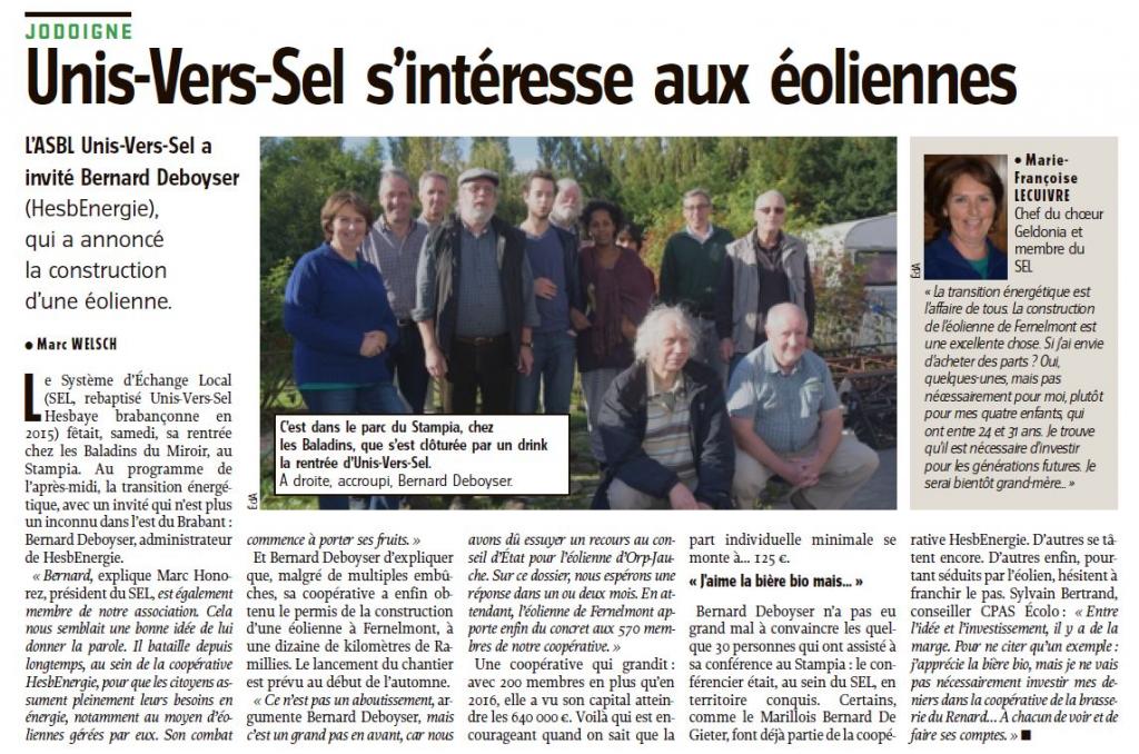 Rentrée de septembre au Stampia avec Bernard Deboyser qui nous a présenté HesbEnergie et ses projets éoliens citoyens. Lire l'article de L'Avenir relatant cette réunion.